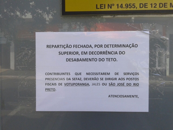 Teto da Secretaria da Fazenda desaba e obriga fechamento da unidade em Fernandópolis