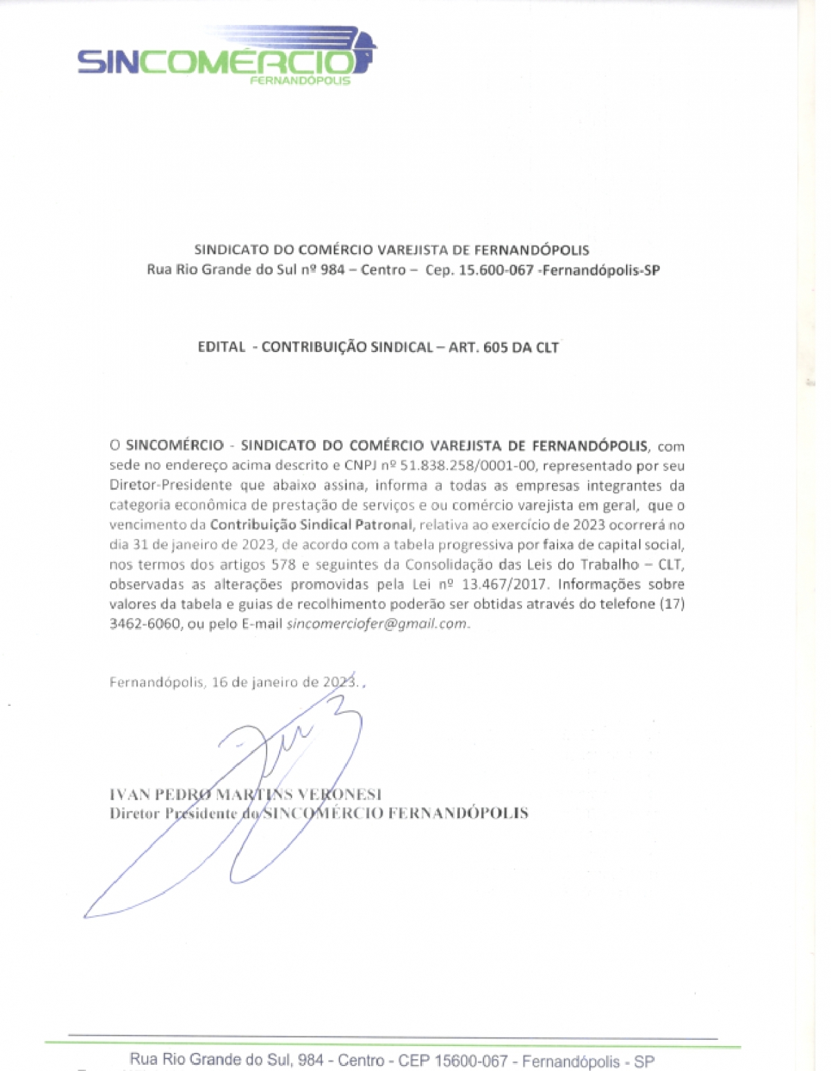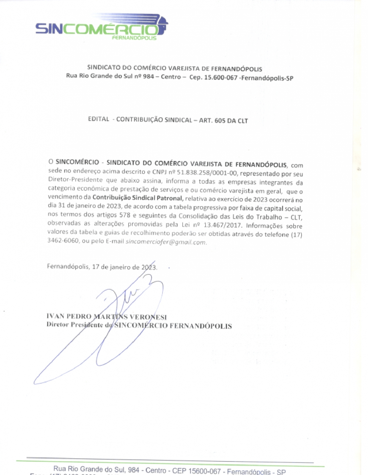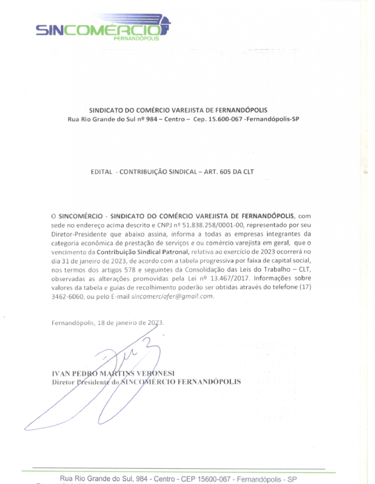 SINDICATO DO COMÉRCIO VAREJISTA DE FERNANDÓPOLIS - EDITAL CONTRIBUIÇÃO SINDICAL