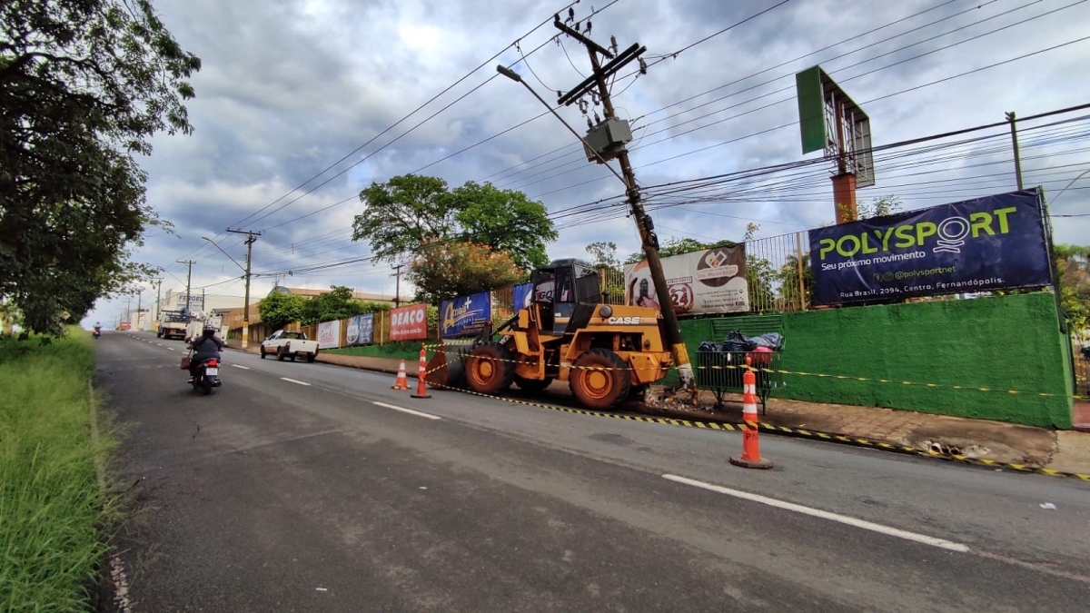 Máquina com problemas mecânicos derruba poste em avenida Marginal