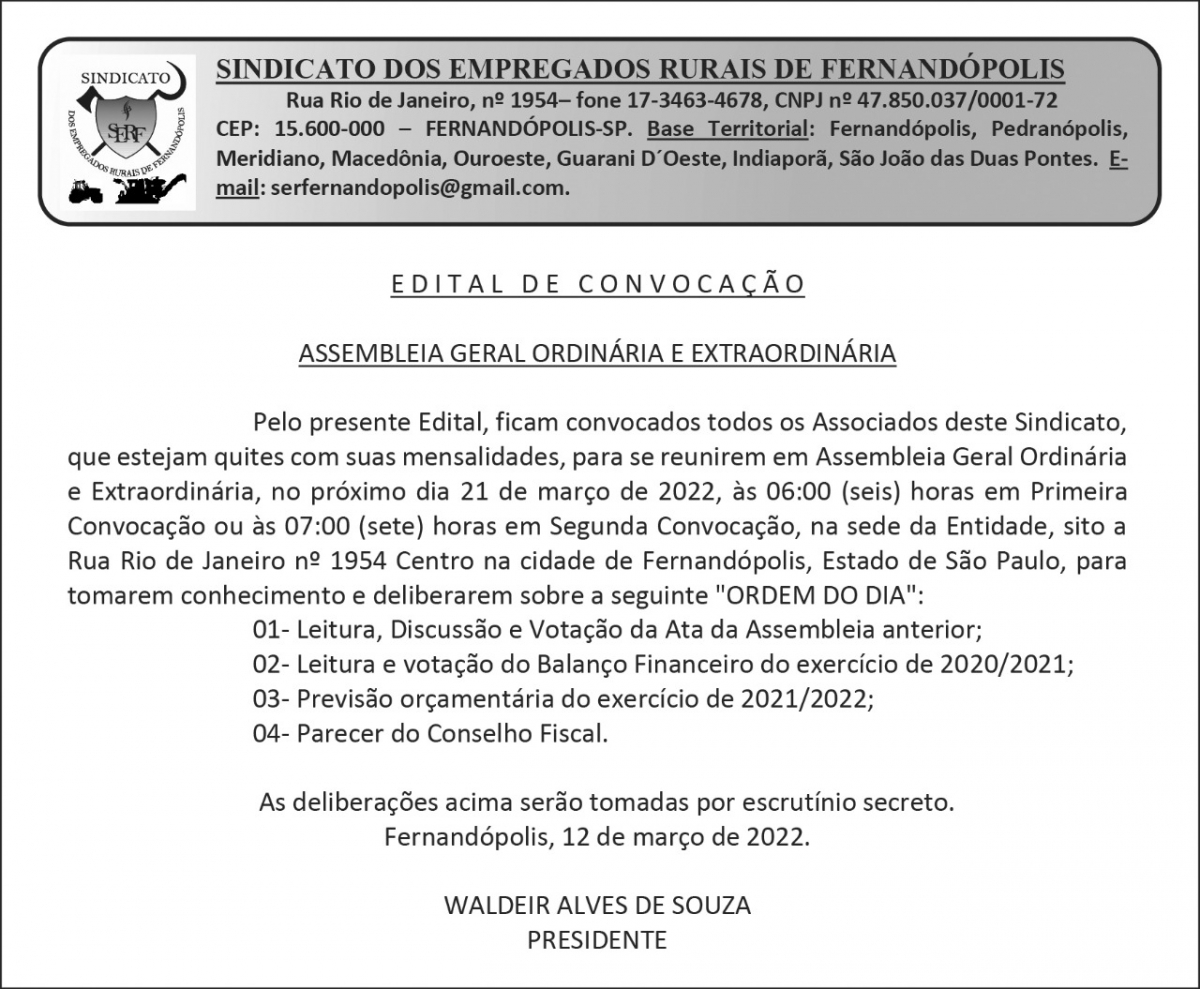 Edital de convocação - Sindicato dos Empregados Rurais de Fernandópolis