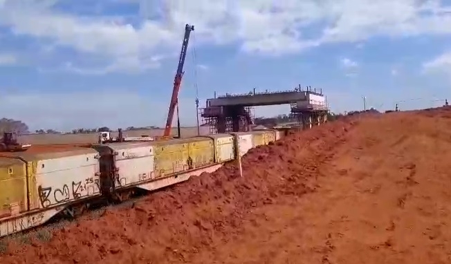 Vigas do primeiro viaduto sobre ferrovia em Fernandópolis são içadas por guindaste