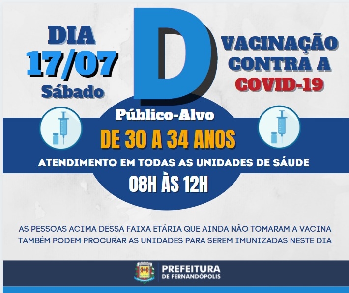 Amanhã, 17, acontece o ‘Dia D’ da vacinação contra Covid-19 para pessoas de 30 a 34 anos