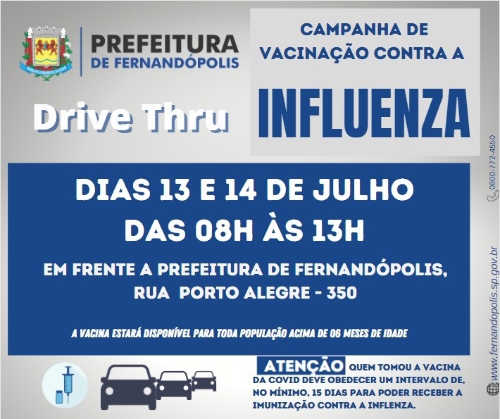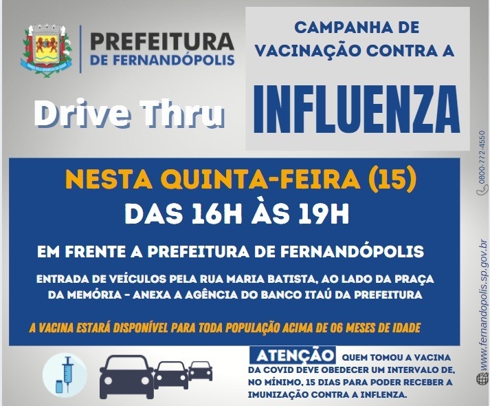 Fernandópolis realiza hoje, 13, até às 13h, o drive thru de vacinação contra a gripe