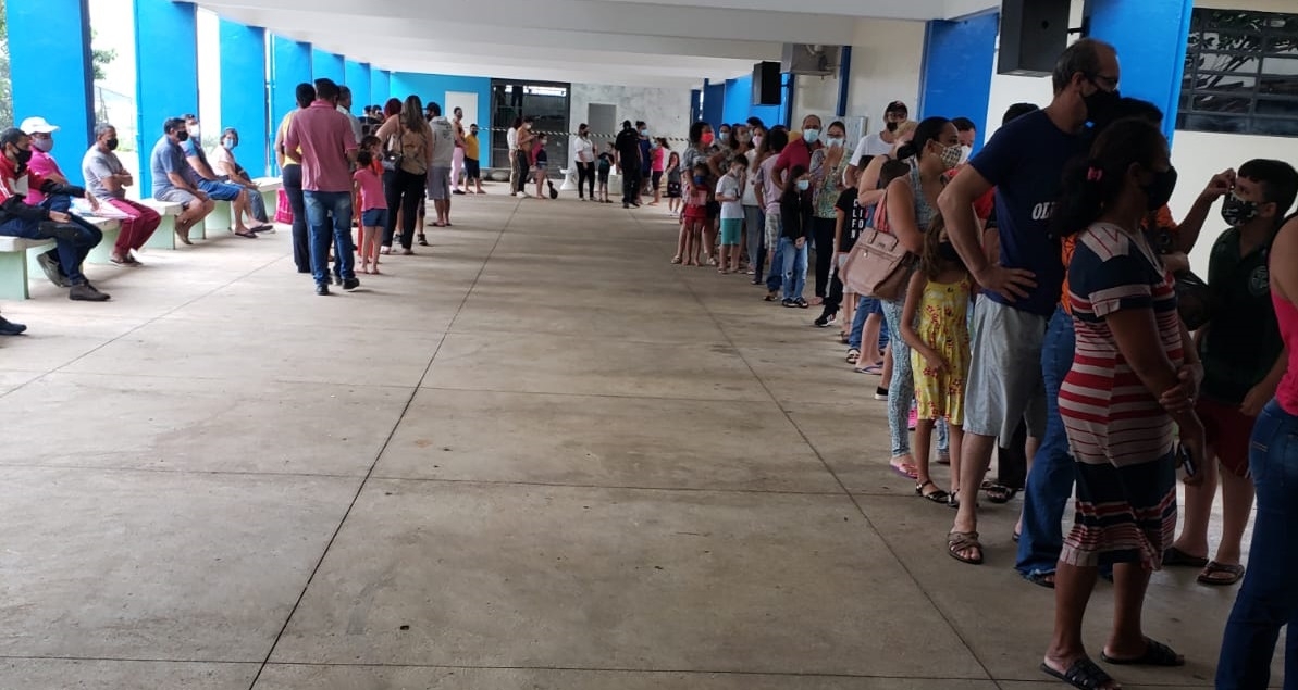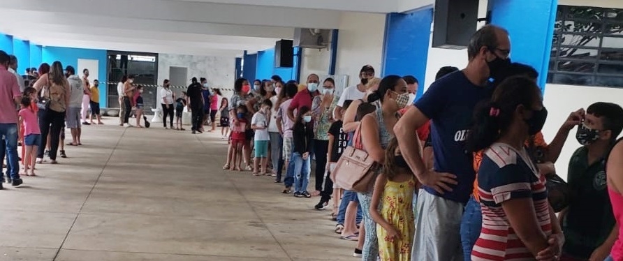 Apesar da chuva, pais fazem fila para vacinar filho contra Covid