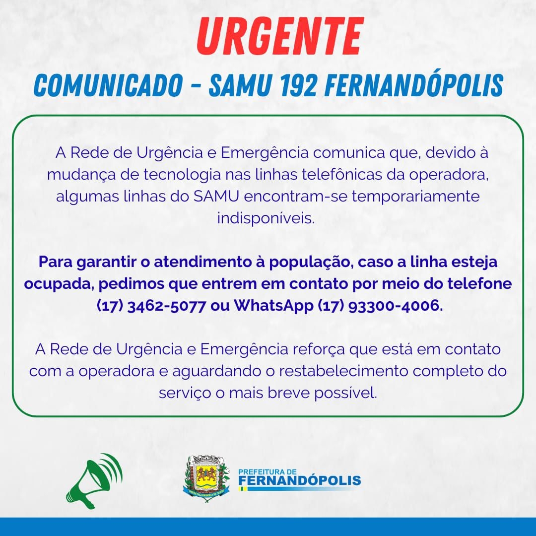 Sem o 192, SAMU divulga novos telefones para emergência em Fernandópolis