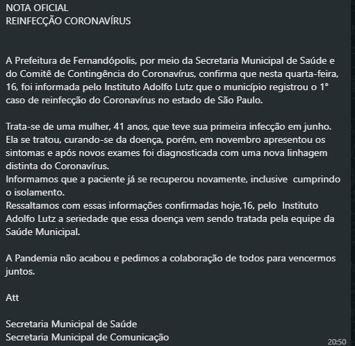 Prefeitura de Fernandópolis confirma, por meio de nota, primeiro caso de reinfecção por Covid-19