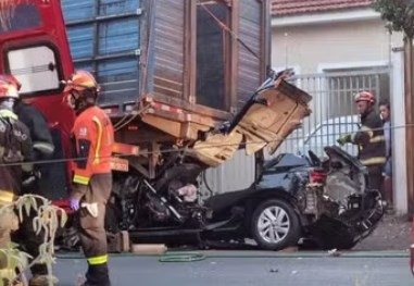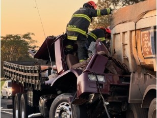 Motorista bate na traseira de caminhão estacionado em Rio Preto e fica preso nas ferragens