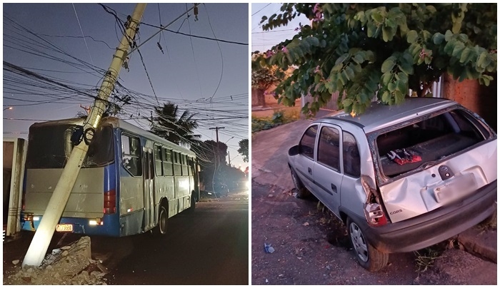 Ônibus desgovernado bate em dois carros e atinge poste em Fernandópolis