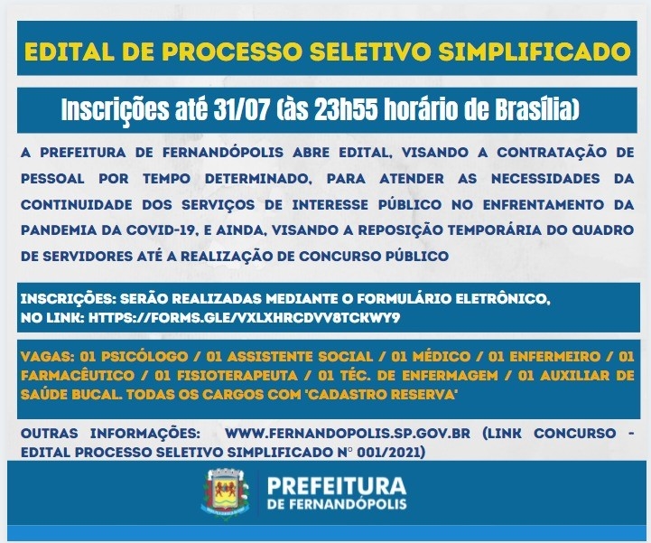 Inscrições do processo seletivo para prefeitura de Fernandópolis estão abertas