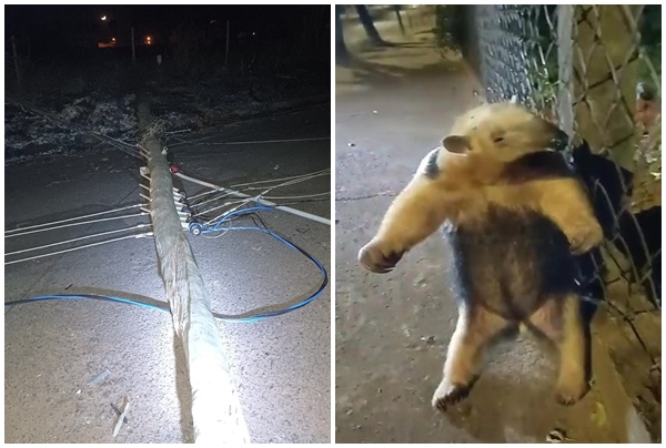 Incêndio em pasto derruba dois postes e deixa moradores sem energia; tamanduá consegue fugir do fogo