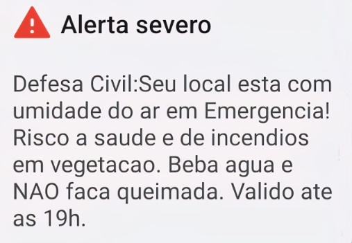 Defesa Civil emite alerta em massa para baixa umidade relativa do ar em Fernandópolis