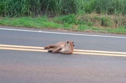 Motoristas registram flagrante de onça-parda deitada no meio da rodovia Percy Semeghini em Brasitânia