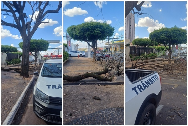 Galho de árvore cai sobre avenida durante ventania na madrugada