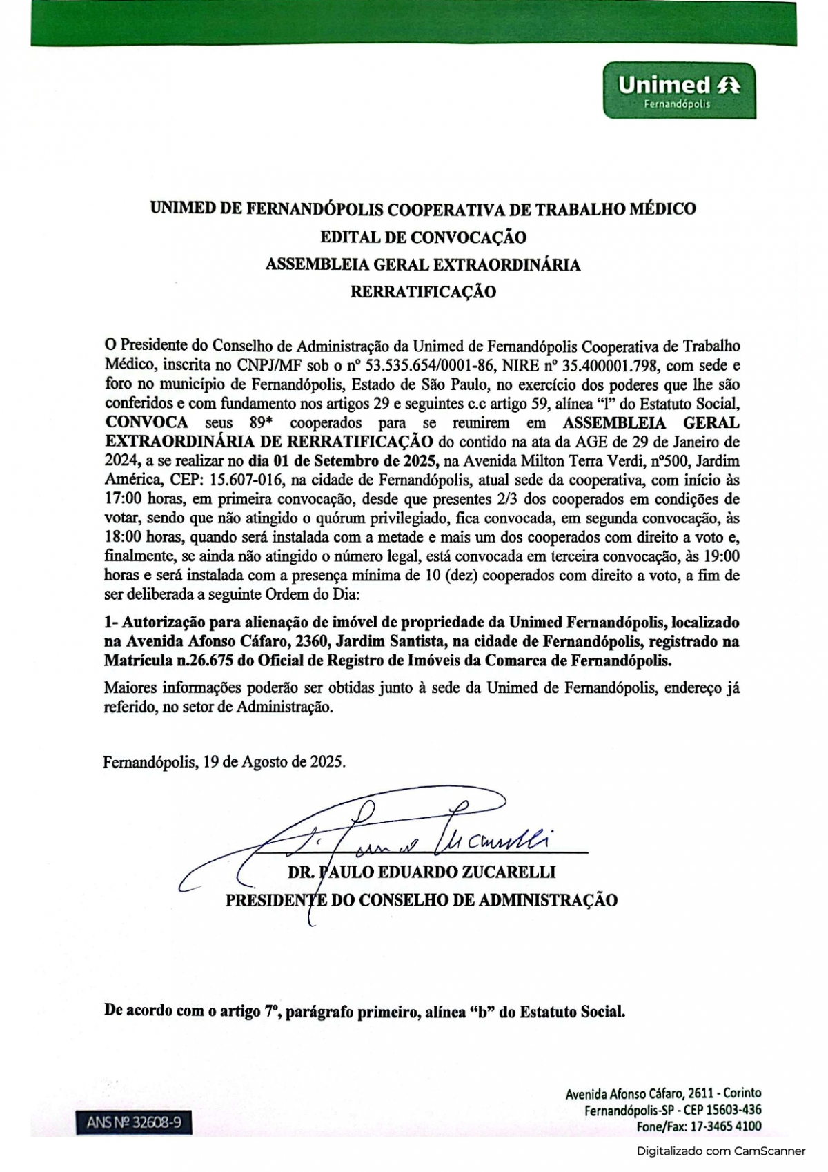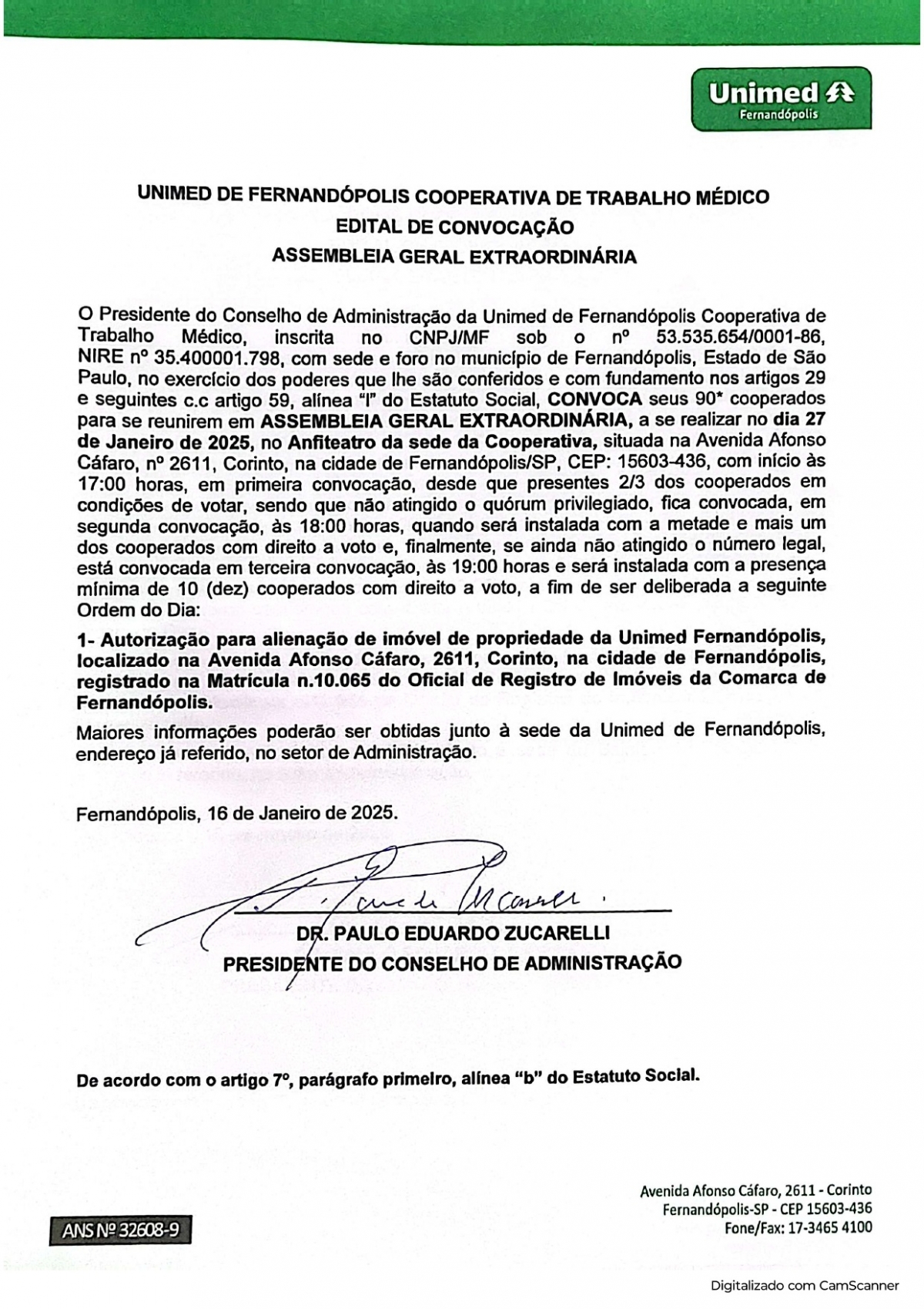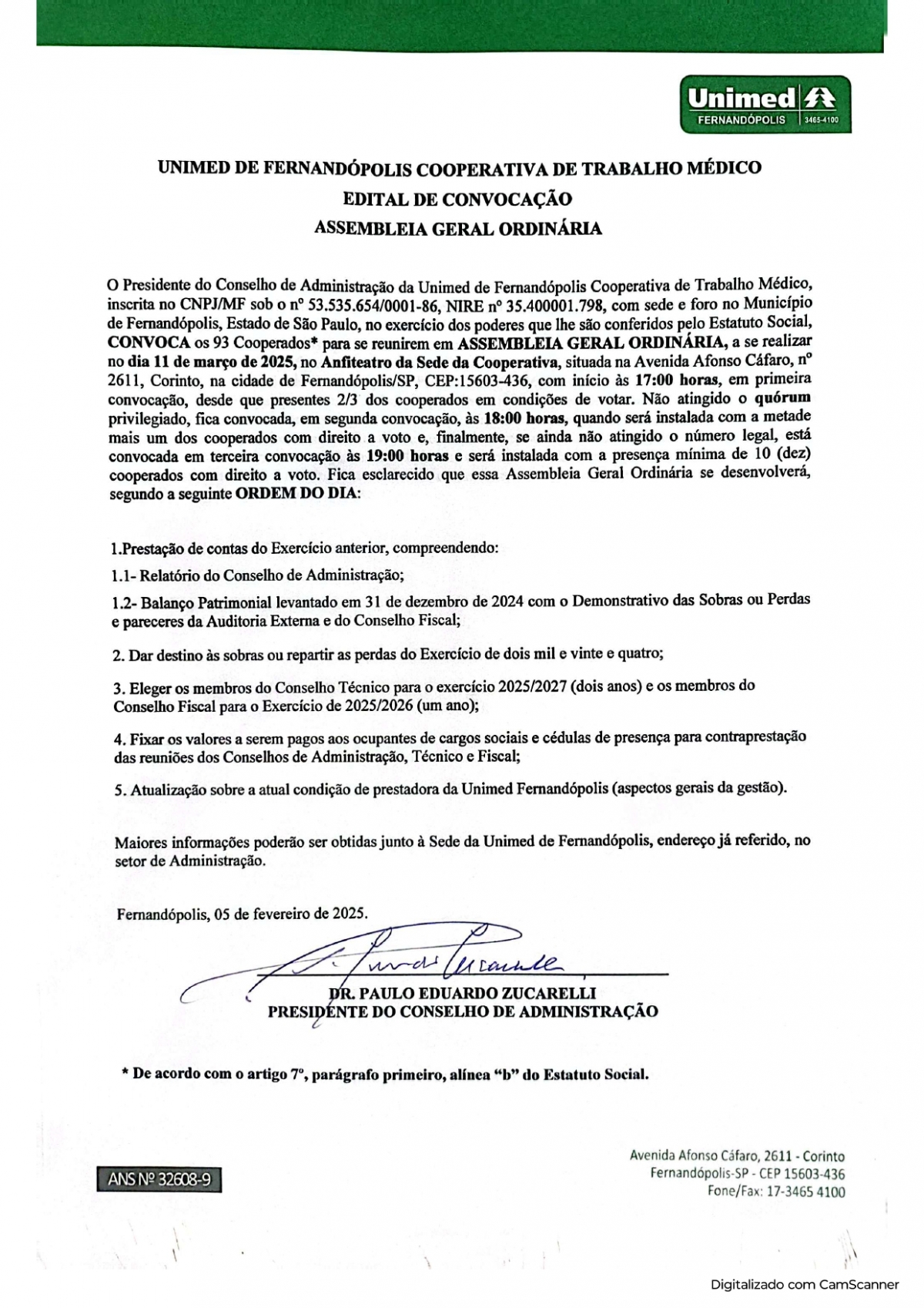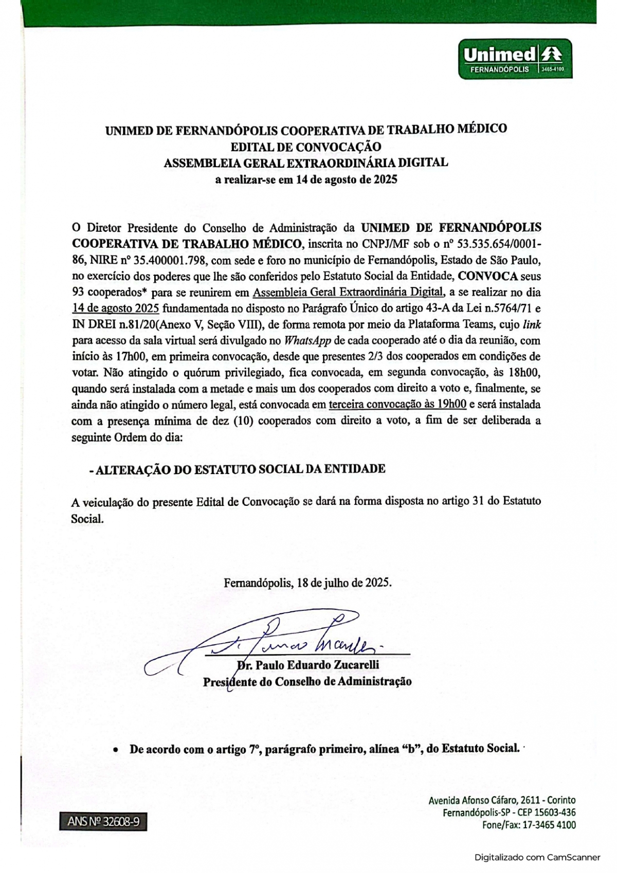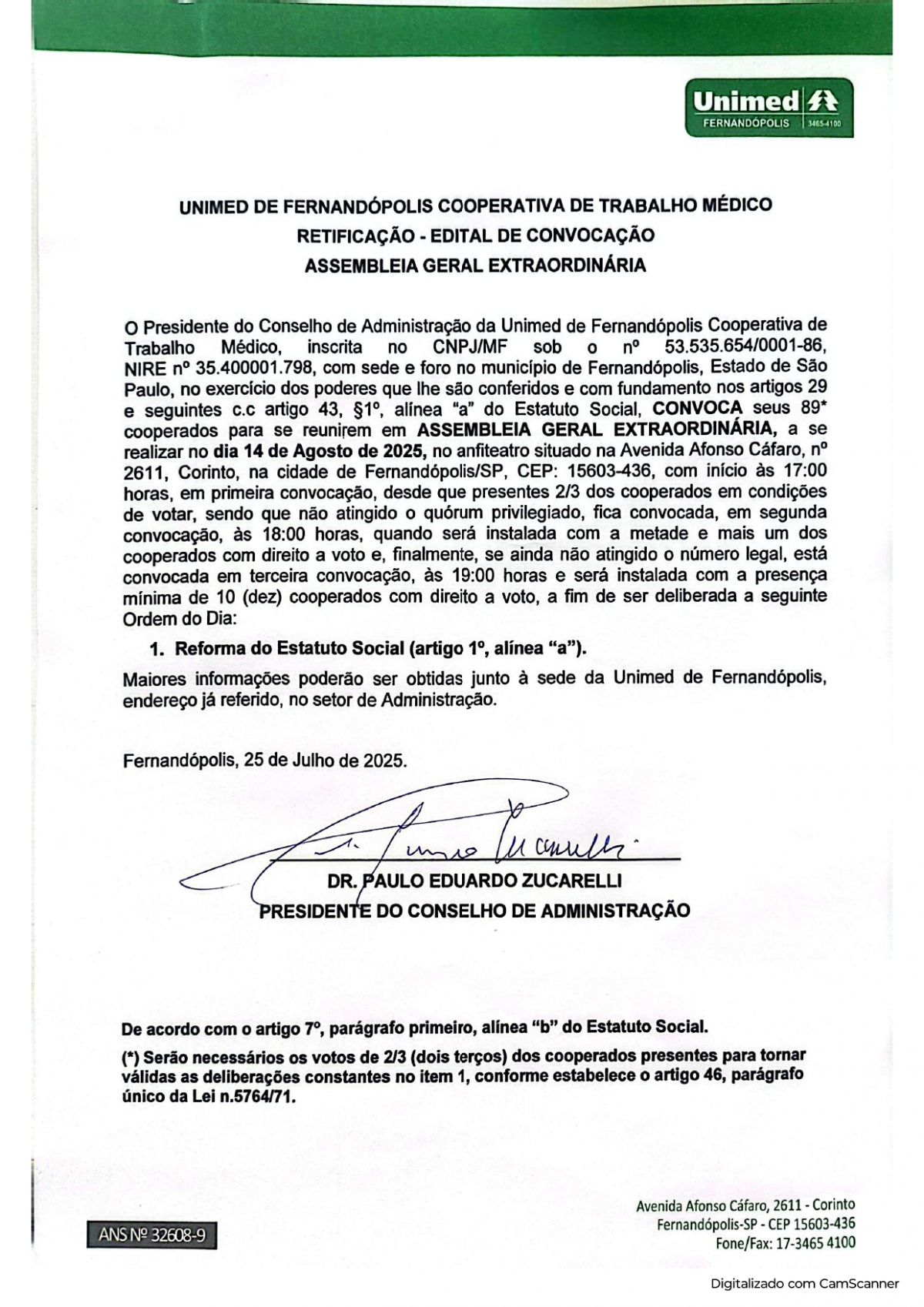 UNIMED FERNANDÓPOLIS - EDITAL DE CONVOCAÇÃO