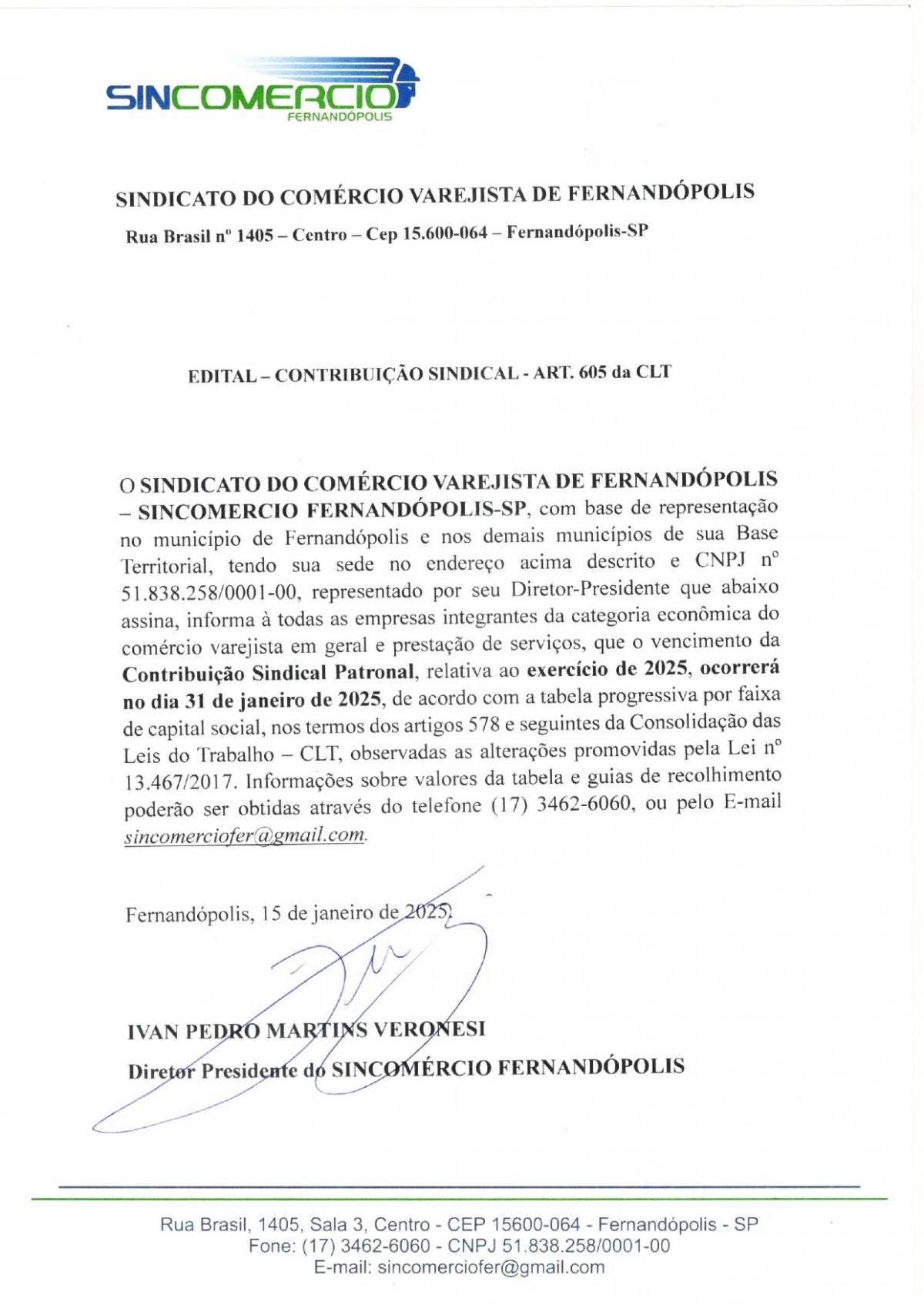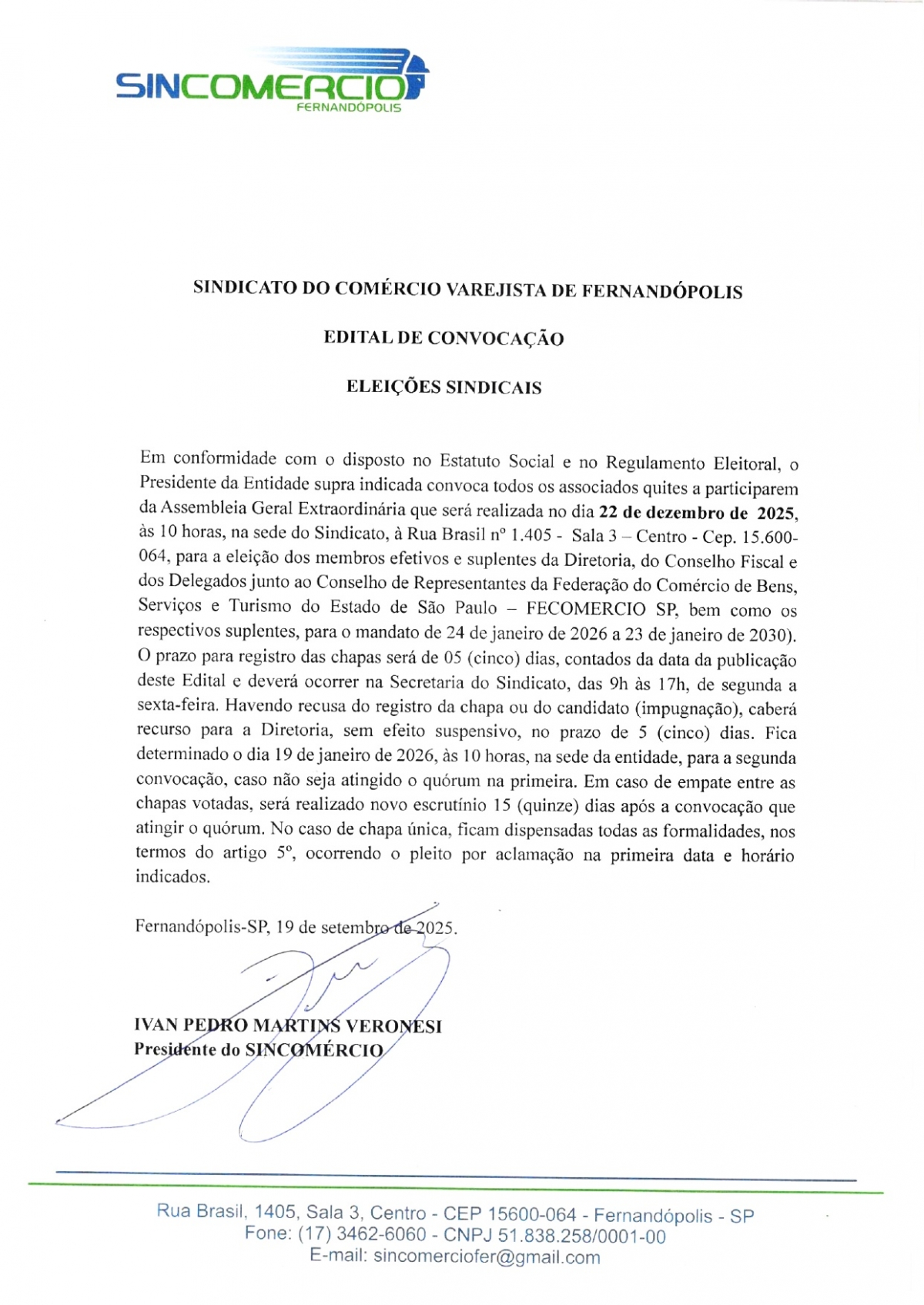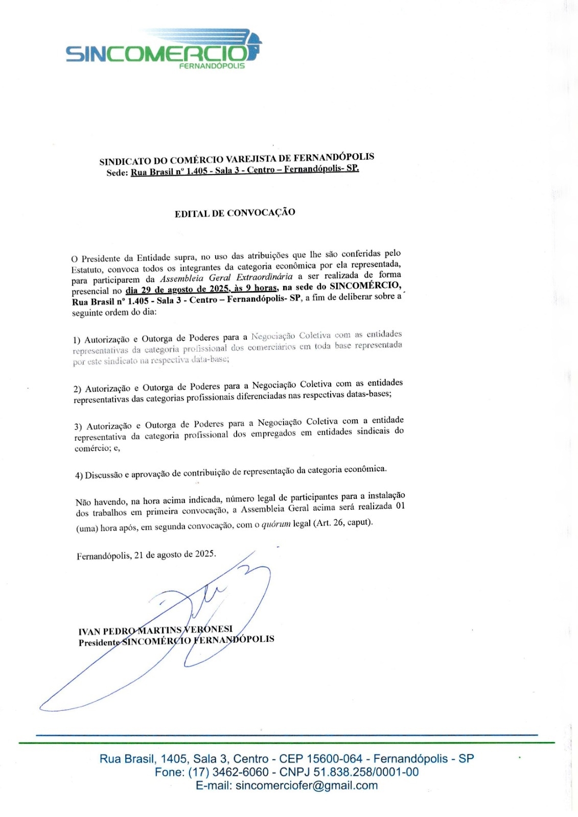 SINCOMÉRCIO FERNANDÓPOLIS - EDITAL DE CONVOCAÇÃO