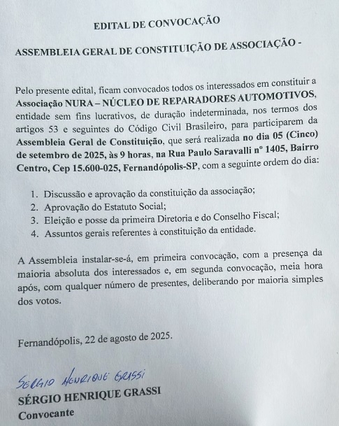 NURA - NÚCLEO DE REPARADORES DE VEÍCULOS / EDITAL DE CONVOCAÇÃO