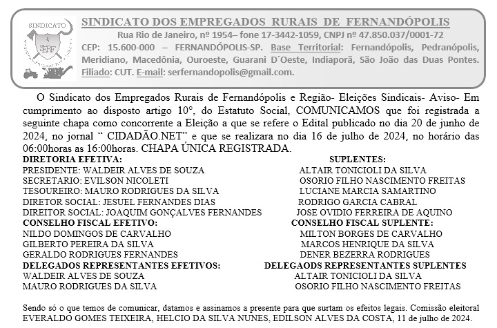 SINDICATO DOS EMPREGADOS RURAIS DE FERNANDÓPOLIS - ELEIÇÕES SINDICAIS
