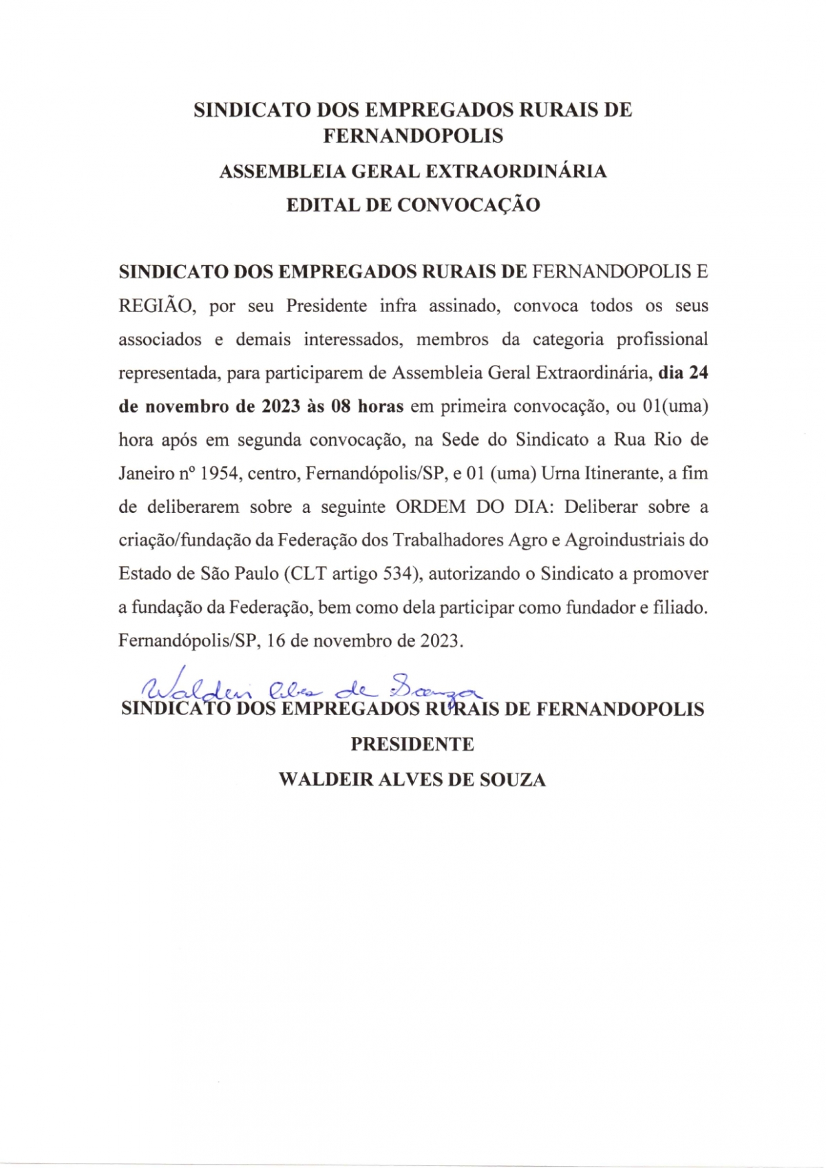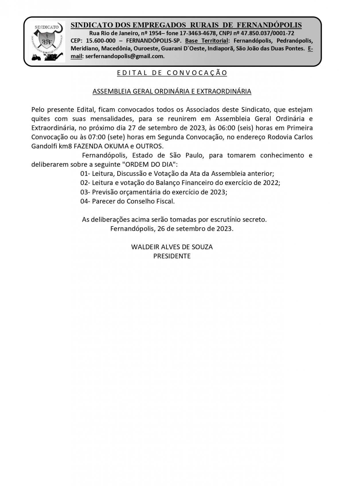 EDITAL DE CONVOCAÇÃO - SINDICATO DOS EMPREGADOS RURAIS DE FERNANDÓPOLIS
