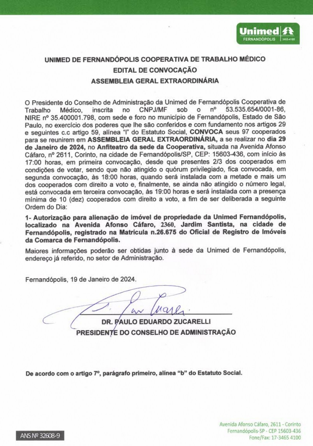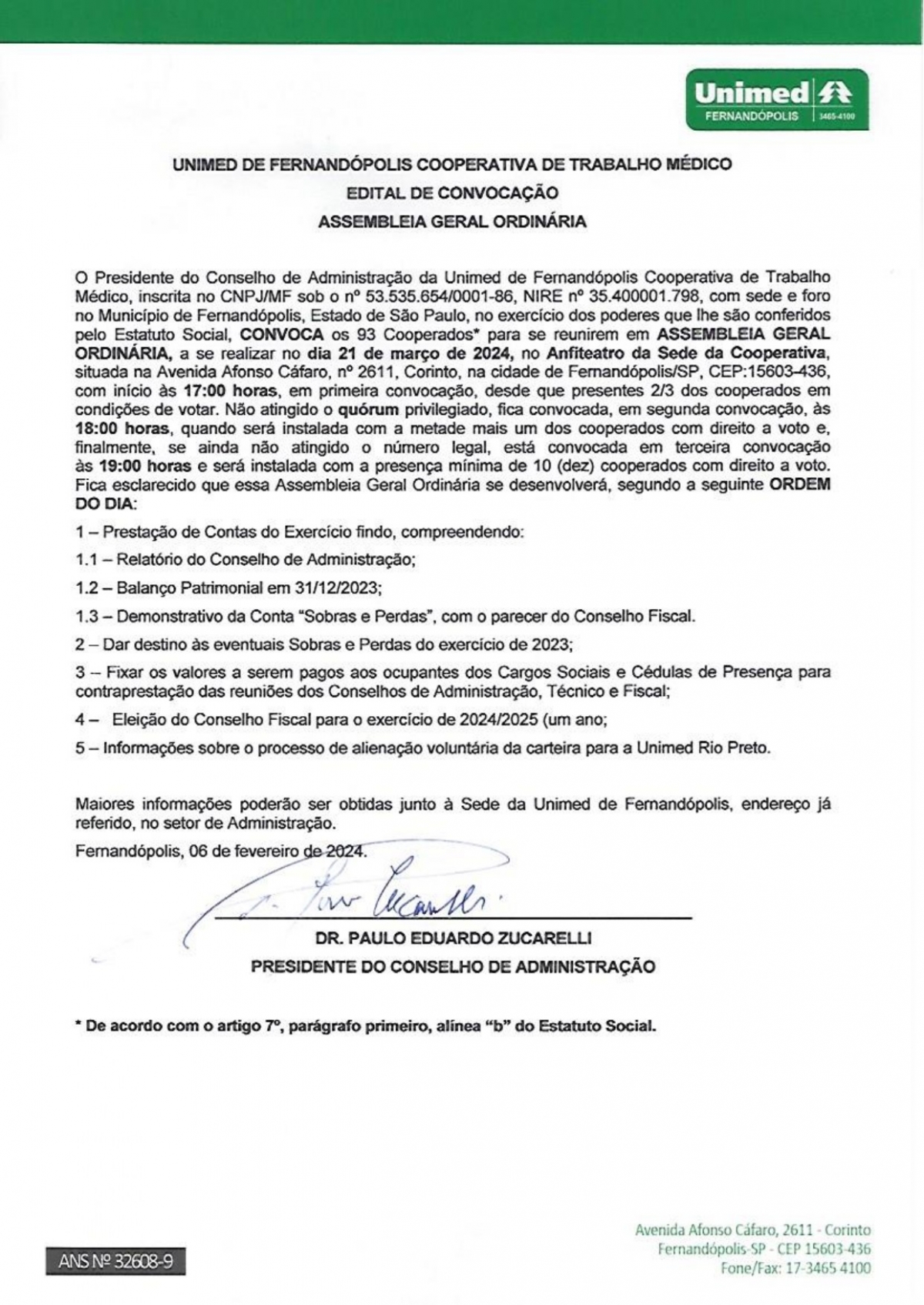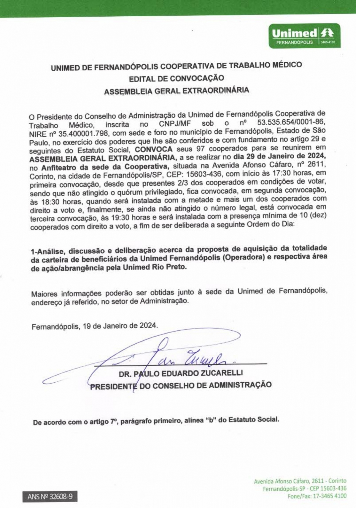 EDITAL DE CONVOCAÇÃO - UNIMED DE FERNANDÓPOLIS