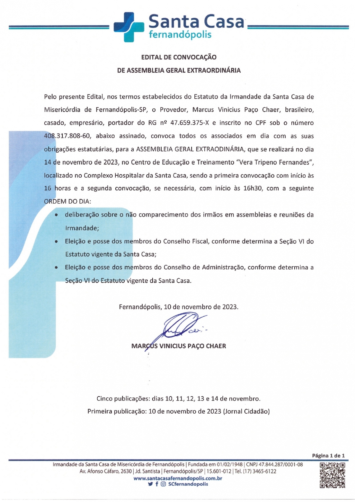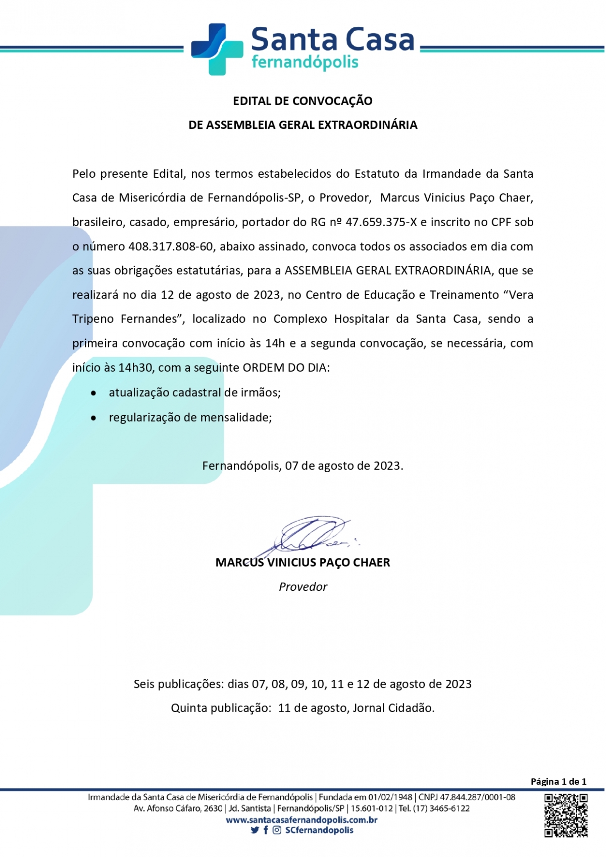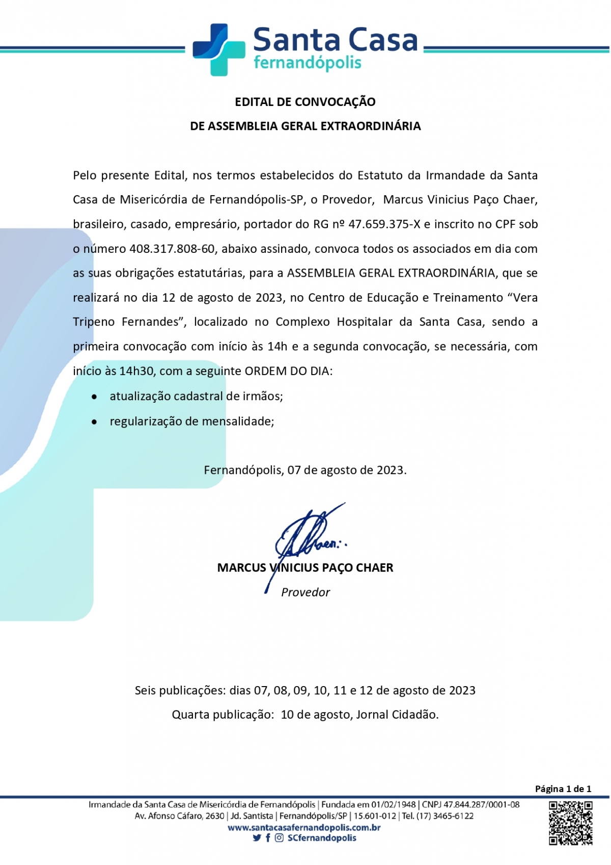 EDITAL DE CONVOCAÇÃO - SANTA CASA DE FERNANDÓPOLIS
