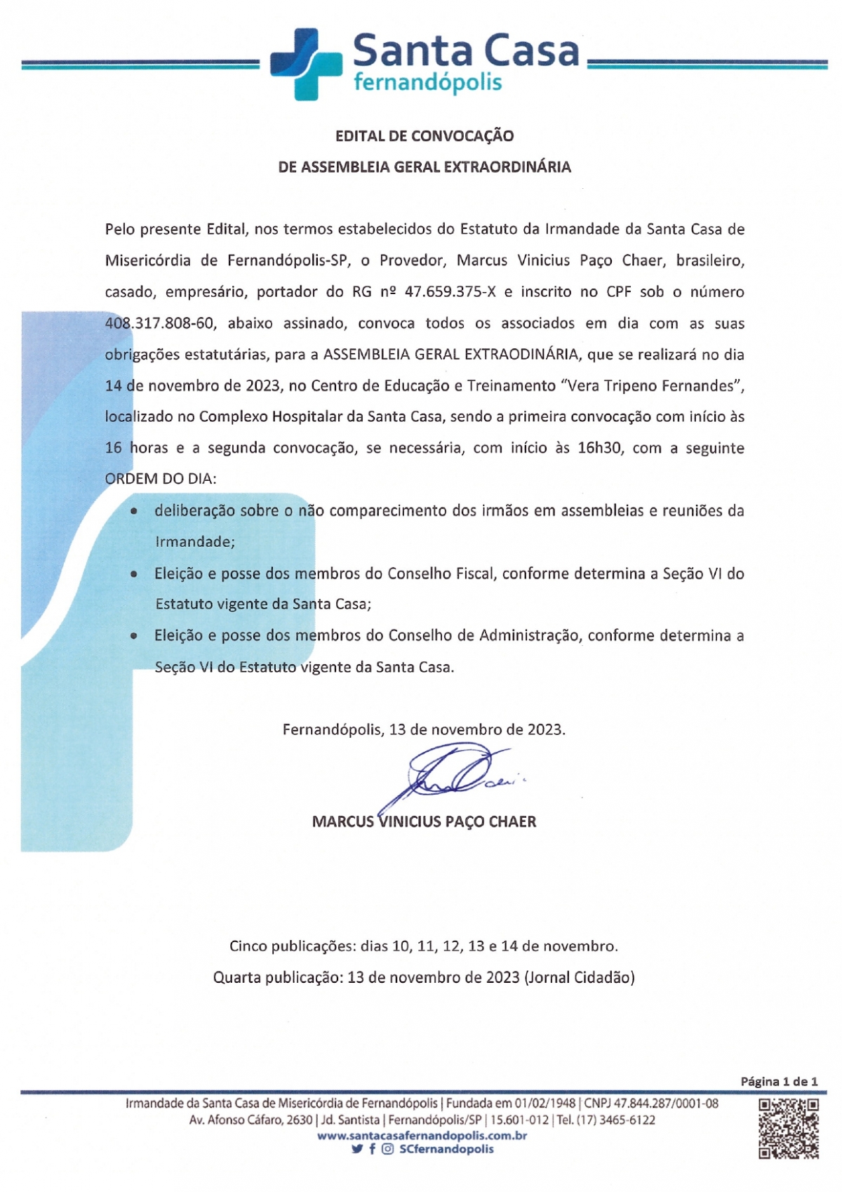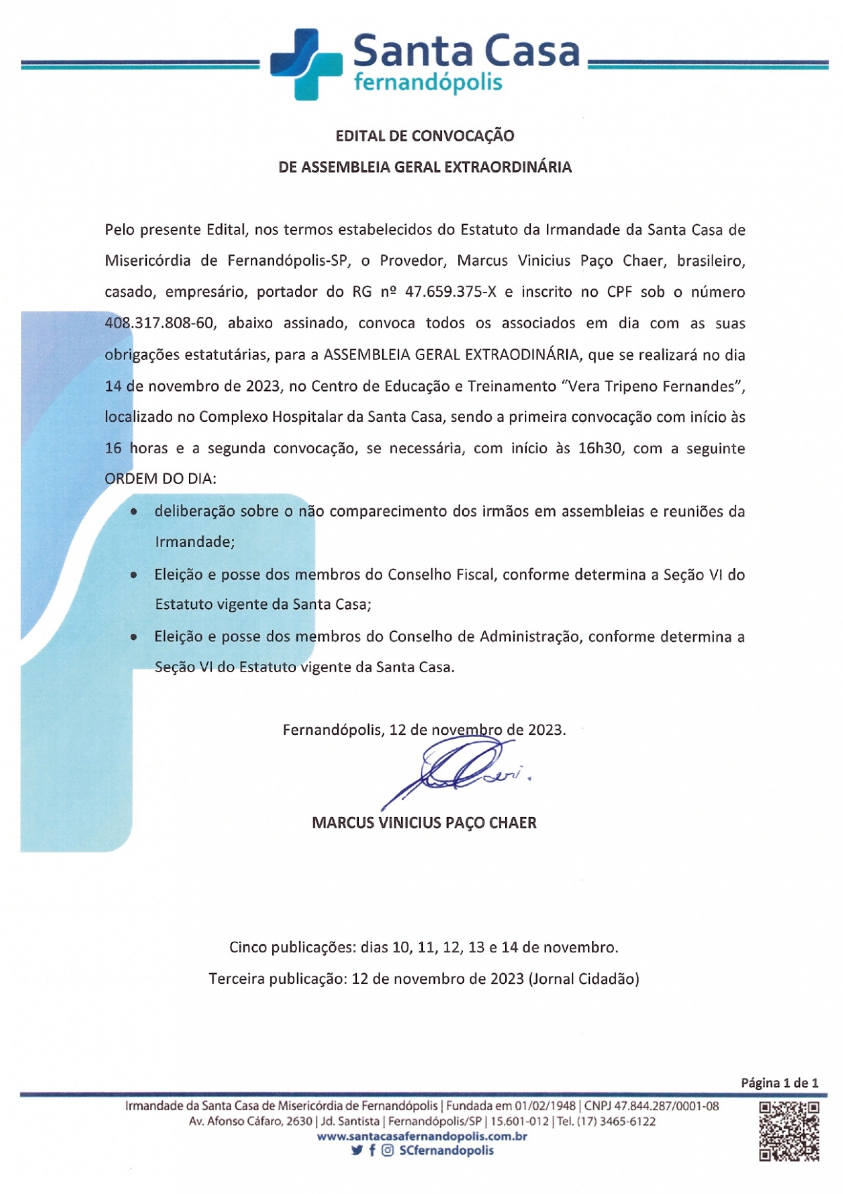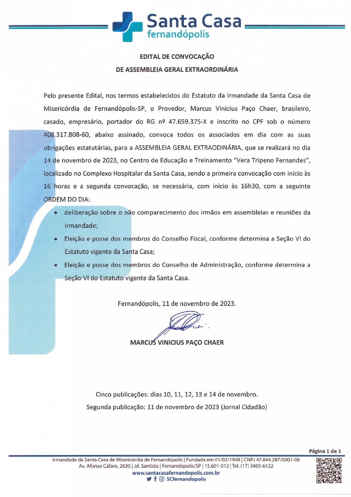 EDITAL DE CONVOCAÇÃO - SANTA CASA DE FERNANDÓPOLIS