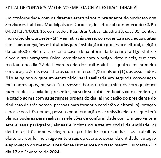 EDITAL DE CONVOCAÇÃO - SINDICATO DOS SERVIDORES PÚBLICOS MUNICIPAIS DE OUROESTE