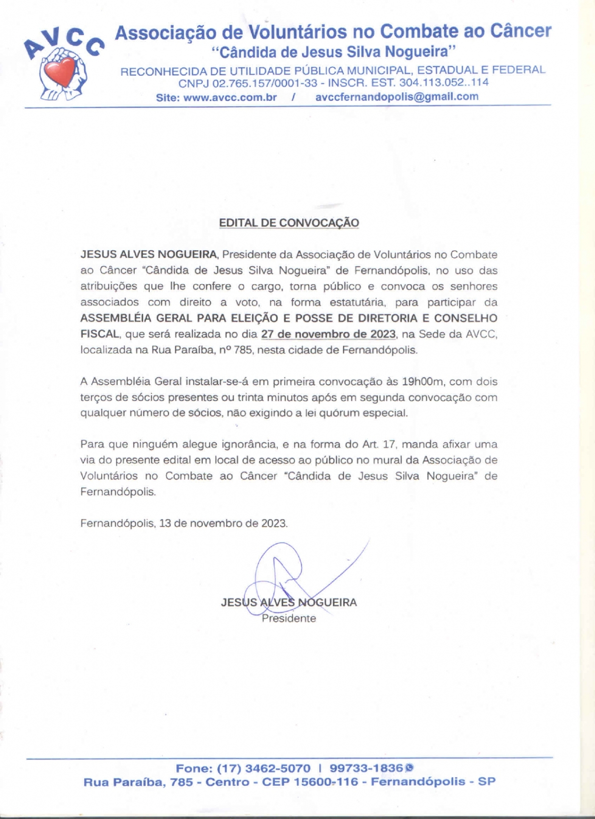 EDITAL DE CONVOCAÇÃO - AVCC FERNANDÓPOLIS