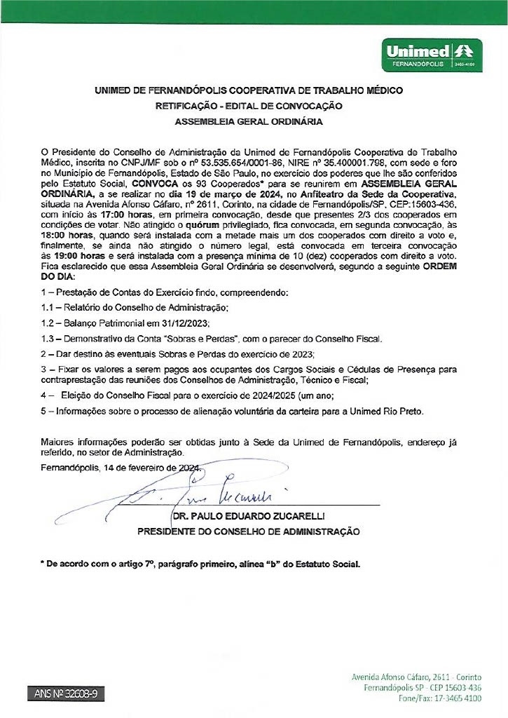 RETIFICAÇÃO - EDITAL DE CONVOCAÇÃO - UNIMED DE FERNANDÓPOLIS