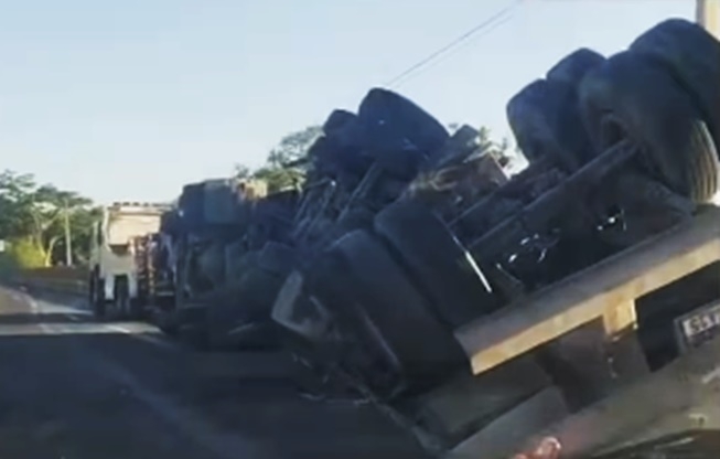 Carreta carregada com ureia tomba na Euclides da Cunha