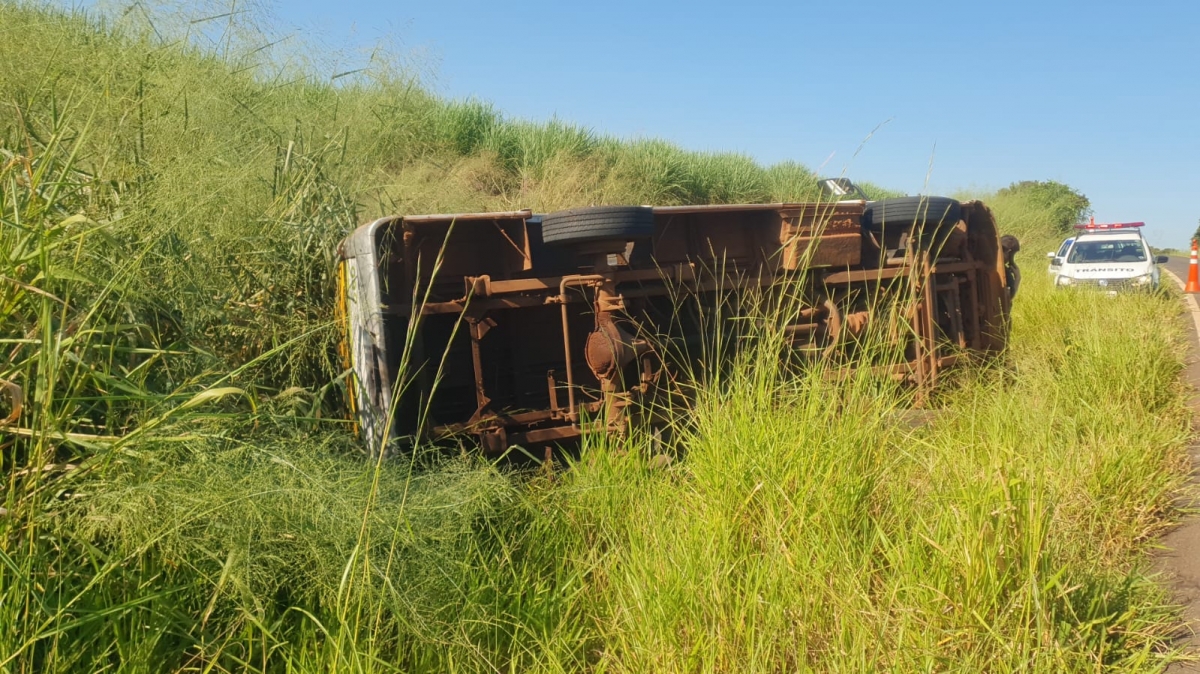 Micro-ônibus com 4 estudantes a caminho de Fernandópolis tomba na Vicinal Carlos Gandolfi