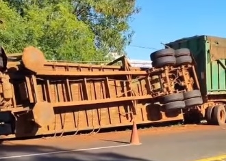Carreta com cana-de-açúcar tomba na rotatória do Jardim Uirapuru na Percy Semeghini