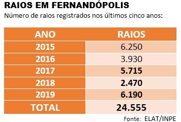 De acordo com Elat, nos últimos cinco anos, Fernandópolis registrou um total de 24.555 raios nuvem-solo, média de 4.911 por ano. Os anos de 2019 e 2015 foram os que mais registraram incidência de raios.