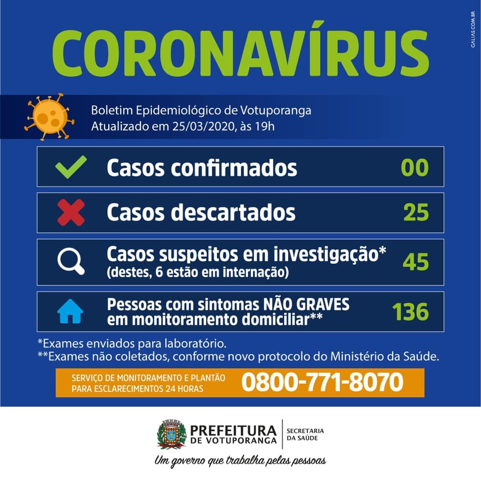 De acordo com as informações do último boletim, Votuporanga reduziu de 53 para 45 o número de casos suspeitos. No decorrer da semana, vem aumentando gradualmente o número de casos descartados, passando de 20 para 25. Apesar de apresentar o maior número de casos suspeitos entre os municípios de Fernandópolis, Jales e Santa Fé do Sul, Votuporanga não tem nenhum caso de contaminação por coronavírus confirmado.