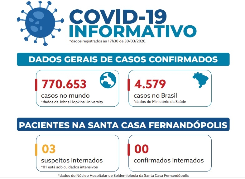 A Santa Casa também iniciou a divulgação diária de boletins médicos sobre a Covid-19. O primeiro boletim informa que três pessoas estão internadas no hospital com suspeita de coronavírus, um deles necessitando de cuidados intensivos. Nenhum dos casos internados tem exame positivo para coronavírus. Os três pacientes são de Fernandópolis. Os dados são do Núcleo Hospitalar de Epidemiologia da Santa Casa.