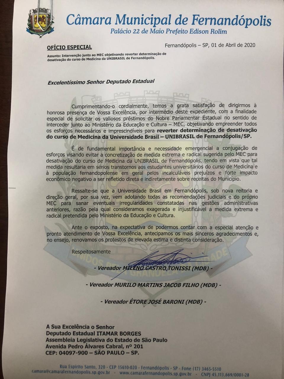 A nova bancada de vereadores do MDB de Fernandópolis encaminhou oficio ao presidente nacional do partido, deputado Baleia Rossi e ao deputado estadual Itamar Borges para que empreendam os esforços necessários para reverter a decisão de desativação do curso de medicina da Universidade Brasil, conforme portaria publicada nesta terça-feira pela Secretaria de Regulação e Supervisão da Educação Superior.