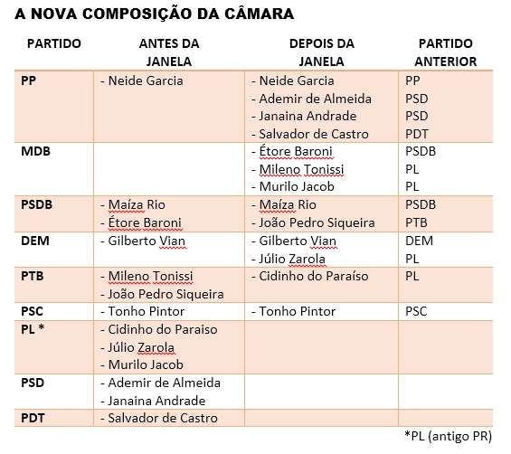 Aparecido Moreira da Silva, o Cidinho do Paraíso, vereador mais votado nas eleições de 2016, deixou o PL e foi para o PTB, que havia perdido João Pedro Siqueira, que foi para o PSDB e Mileno Tonissi que é um dos novos integrantes do MDB.