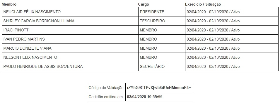 Além de Neuclair Felix Nascimento (presidente) compõem a provisória Shriley Garcia Bordignon Uliana (tesoureira), Márcio Donizeti Viana e Nelson Felix Nascimento, que é pai do presidente. A vigência dessa comissão é de 2 de abril a 2 de outubro. A eleição municipal acontece no dia 4 de outubro.
