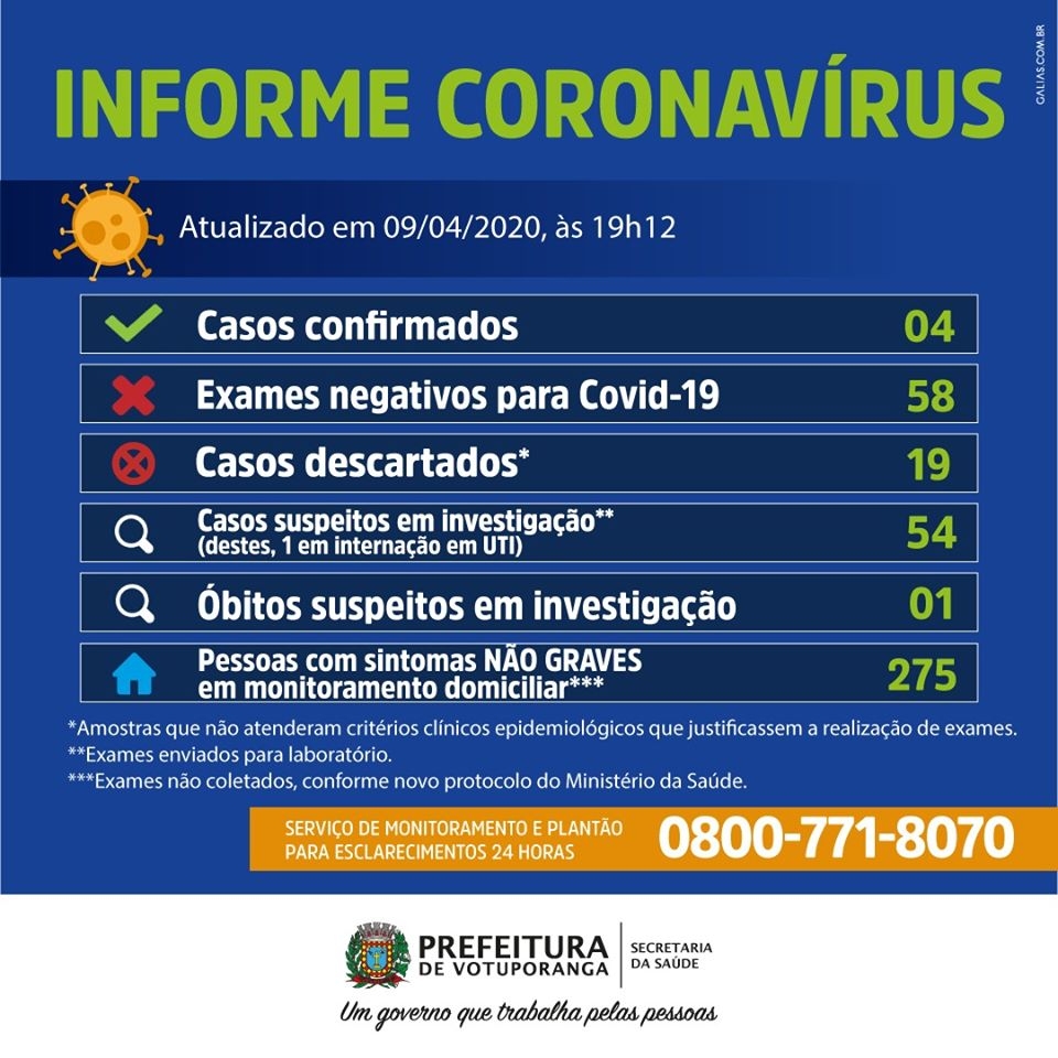 Por meio do boletim epidemiológico desta quinta-feira, a Secretaria da Saúde informou sobre o quarto caso confirmado do novo vírus no município. O paciente é um homem, entre 40 e 49 anos, que passa bem e teve alta do isolamento domiciliar.