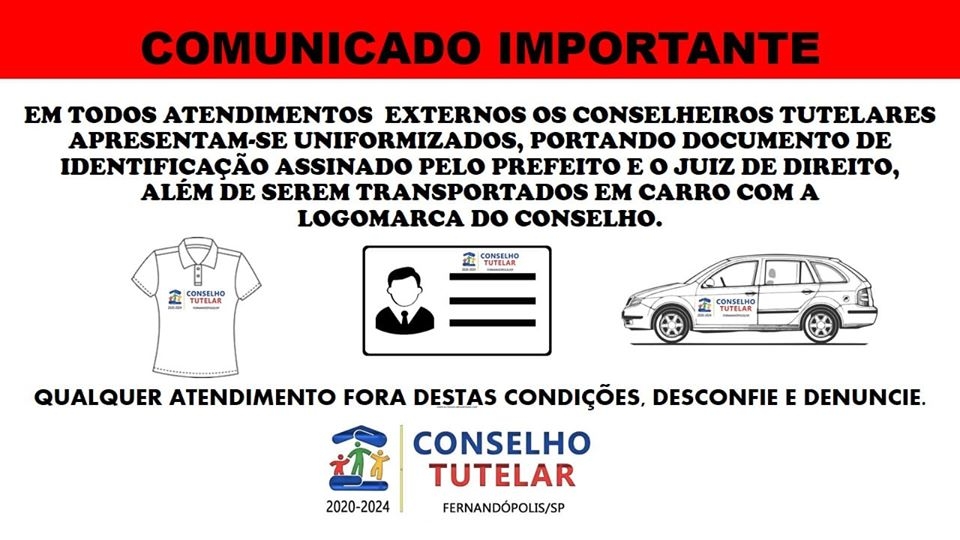 Em post publicado numa rede social na tarde desta quarta-feira, 22, o Conselho Tutelar de Fernandópolis faz um alerta para a população sobre procedimentos adotados pelos conselheiros durante atendimentos externos.