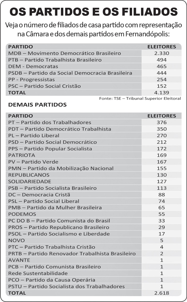 Os números de Fernandópolis mostram que estão filiados a partidos políticos um total de 6.757 eleitores. Esse número corresponde a 12% do eleitorado fernandopolense, atualizado pelo TSE este mês em 54.069 eleitores (46.121 com cadastramento biométrico realizado). É também 7,6% menor do que o registrado nas eleições de 2018 que era de 7.318.