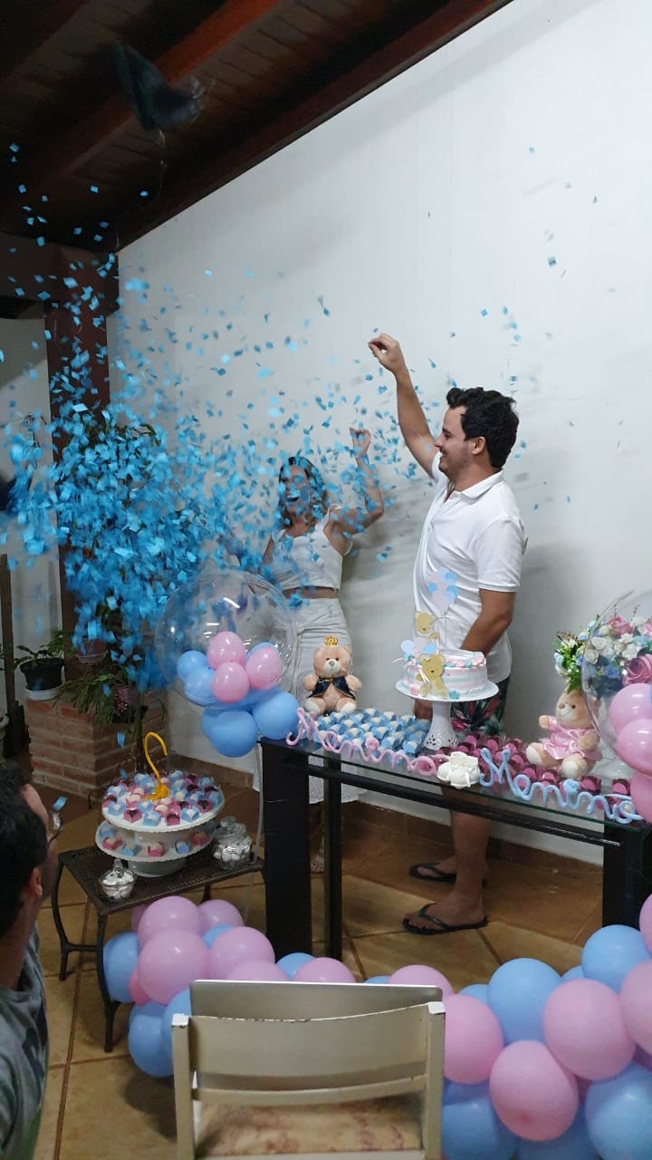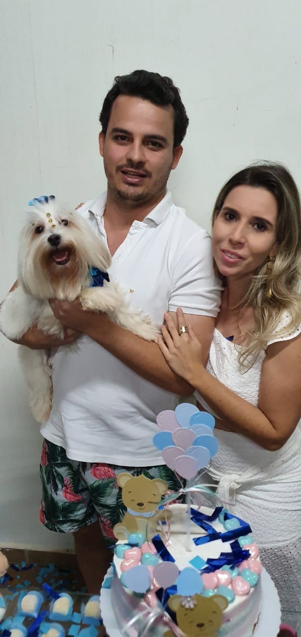 A grávida que não queria descobrir o sexo do bebê na sala do médico e sim passar pela emoção da revelação contou: “Foi emocionante a descoberta estourando o balão preto e com a chegada da minha cachorrinha Lolla vestida de azul, tudo preparado pela minha amiga Leticia”, disse.