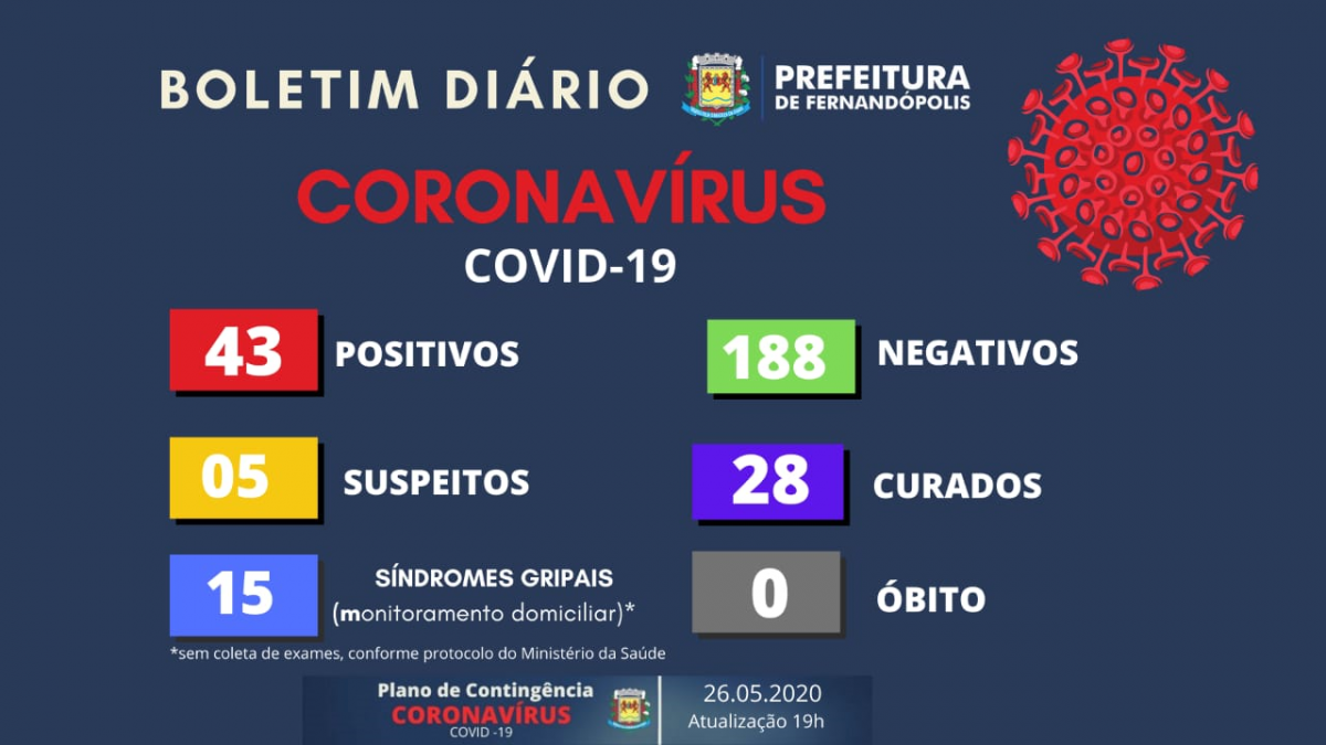 A Prefeitura de Fernandópolis informou nesta terça-feira, 26, que foram confirmados mais cinco novos casos de Covid-19 no município. Todos os pacientes estão sendo acompanhados pela Equipe de Saúde.