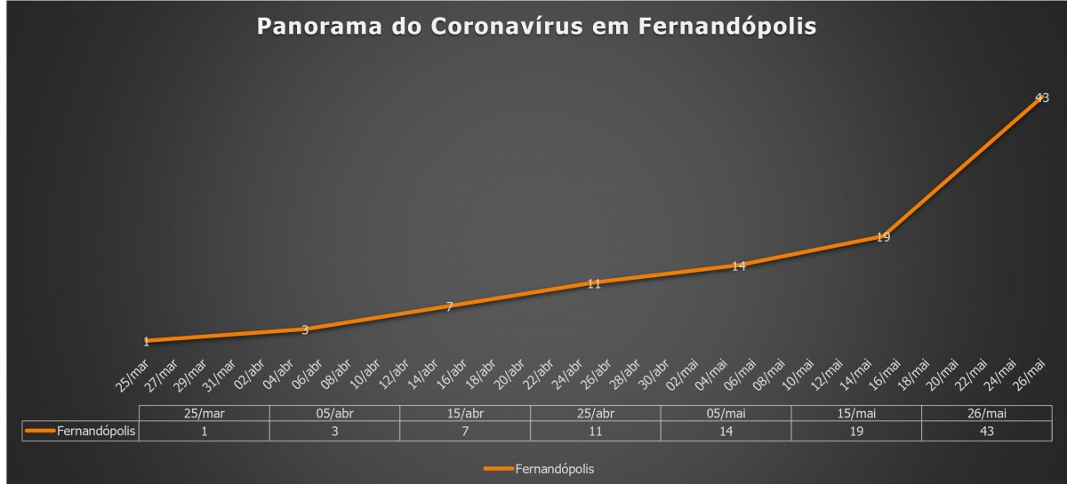 No gráfico com o panorama dos casos de coronavírus em Fernandópolis, a curva acentuada para cima mostra o aumento do número registrados até esta terça-feira.