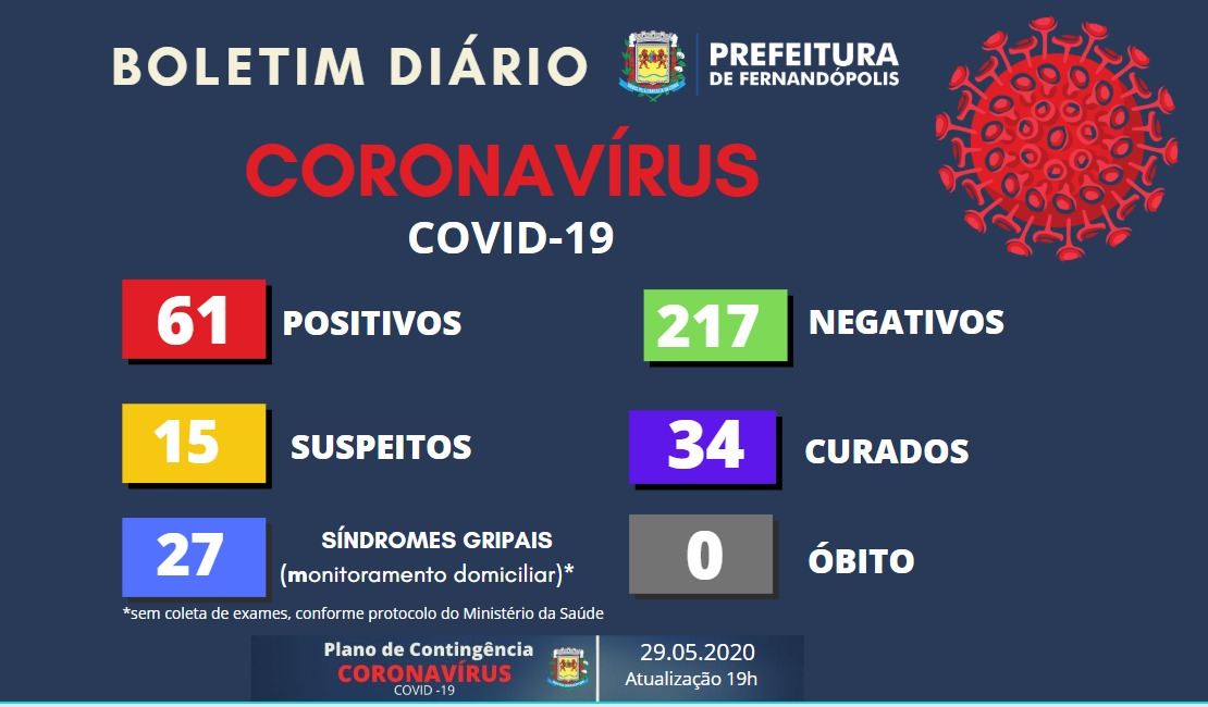 A Prefeitura de Fernandópolis informa que foram confirmados nesta sexta-feira, 29, mais nove casos positivos de Covid-19 no município, totalizando 61. Segundo a prefeitura, desse total, 34 já curados. Todos os pacientes estão sendo acompanhados pela Equipe de Saúde do município.