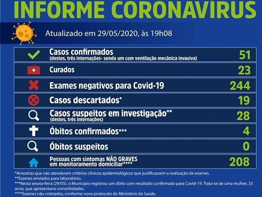 Votuporanga registrou mais quatro casos positivos de coronavírus nesta sexta, contabilizando 51. Desse total, 23 pacientes já estão curados, 24 em tratamento e quatro vieram a óbito.