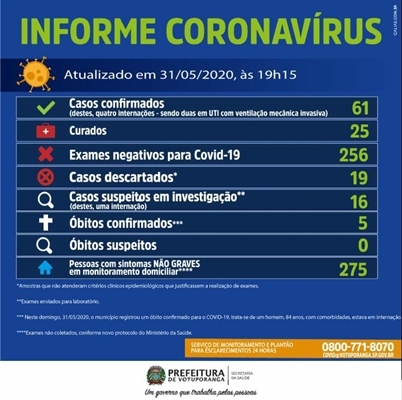 A Secretaria Municipal da Saúde confirmou na noite deste domingo, 31, a quinta morte por coronavírus em Votuporanga. Trata-se de um homem de 84 anos que estava internado, porém estável, mas seu quadro piorou e ele acabou morrendo.