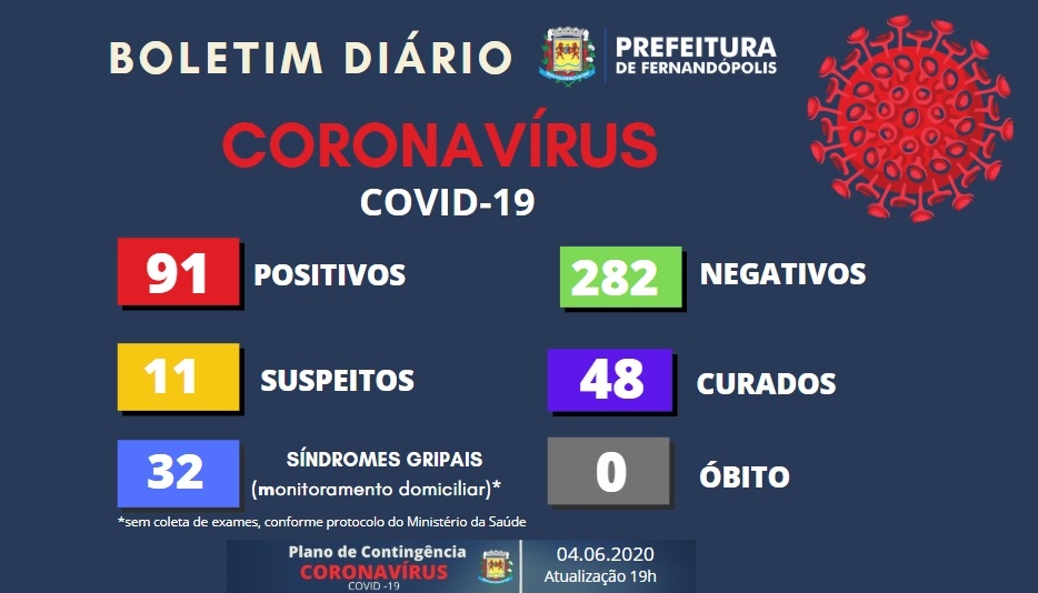 A Prefeitura de Fernandópolis informou que nesta quinta-feira, 4, foram registrados 10 novos casos positivos de coronavírus e chega a 91 ao todo.