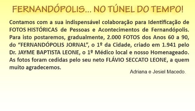 Fernandópolis no Túnel do Tempo é uma galeria virtual que reunirá mais de quatro mil fotografias antigas doadas dos acervos pessoais de moradores e tem como objetivo identificar por meio das fotos postadas numa rede social, o nome das pessoas ou autoridades fotografadas em Fernandópolis no decorrer dos últimos 60 anos. A ideia é do casal Jesiel Bruzadelli Macedo e da esposa Adriana que já postaram mais de 150 fotos do acervo pessoal do Dr. Jayme Baptista Leone, primeiro médico e também proprietário do primeiro jornal da cidade, o “Fernandópolis Jornal”. O material foi cedido por Flávio Seccato Leone, neto do Dr. Jayme.