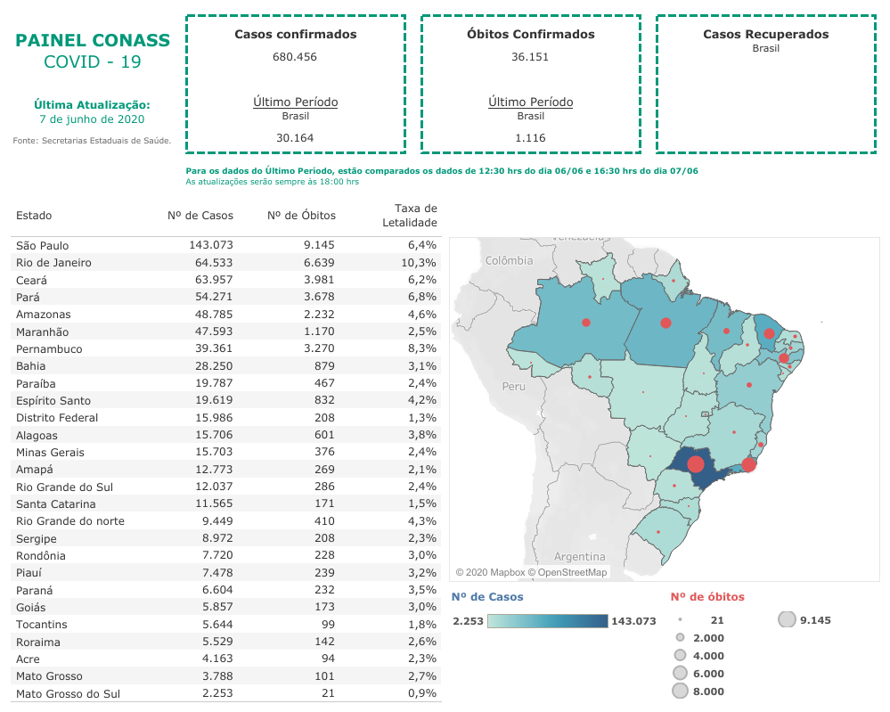 O Conass afirma estar atuando pautado “pelo mais alto interesse público”, com vista à “defesa da saúde e da vida” dos brasileiros. Segundo o painel da covid-19, até as 16h30 do domingo, o número de casos confirmados da doença já chegava a 680.456. Além disso, entre 12h30 de sábado, 6, e as 16h30 de domingo, foram registradas 1.116 novas mortes, elevando para 36.151 o total de óbitos registrados desde que a circulação do novo coronavírus no Brasil foi confirmada, em meados de março.