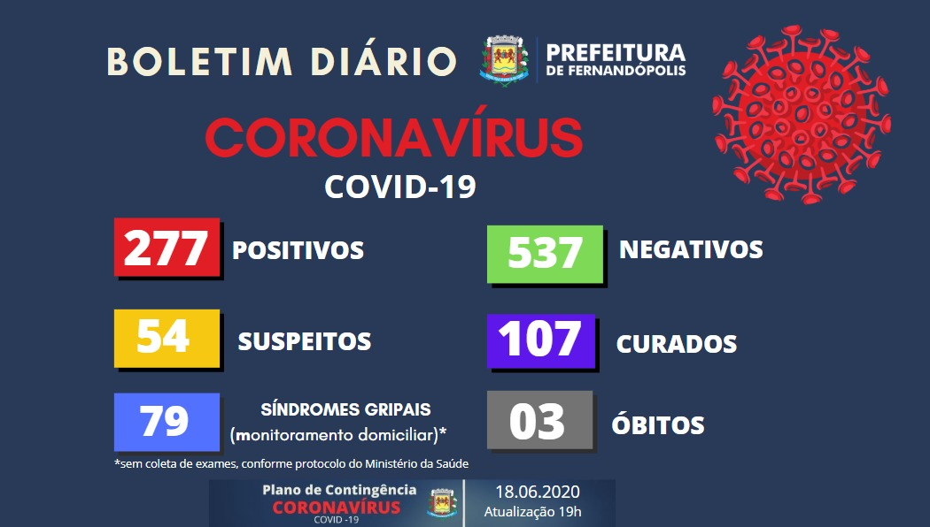 Segundo a prefeitura, dos pacientes positivos, 107 estão recuperados. Considerando os boletins divulgados pela prefeitura e Santa Casa, dos demais pacientes que ainda não estão curados, 11 estão internados, 156 em acompanhamento pelos profissionais da Saúde e três morreram em decorrência da doença, totalizando 277 infectados.